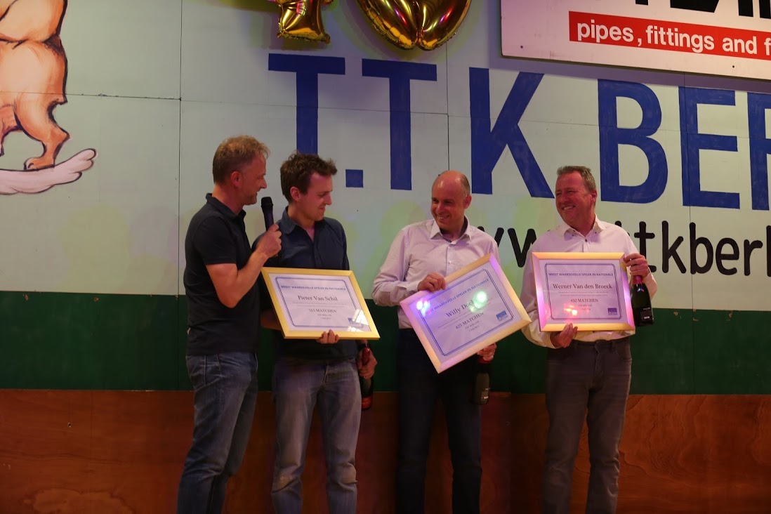 Daarna werden de spelers gehuldigd met de grootste staat van dienst in de nationale reeksen. Werner Van den Broeck speelde er al de meeste wedstrijden voor onze club, gevolgd door Willy Dockx en Pieter Van Schil.
