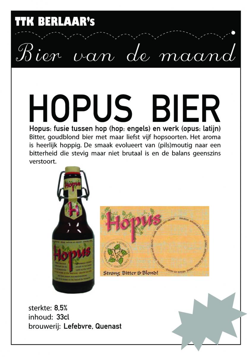 Vanaf zaterdag 19 september kunnen de speciale biertjes dus gedegusteerd worden in een authentiek Bier van de Maand-glas. Ongeveer elke maand worden een paar bakken besteld van een uitzonderlijk biertje. Het aanbod is altijd beperkt, dus wees er snel bij. Hier ziet u in primeur al de affiche van het eerste Bier van de Maand: Hopus. Gezondheid!