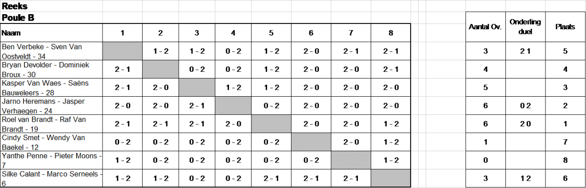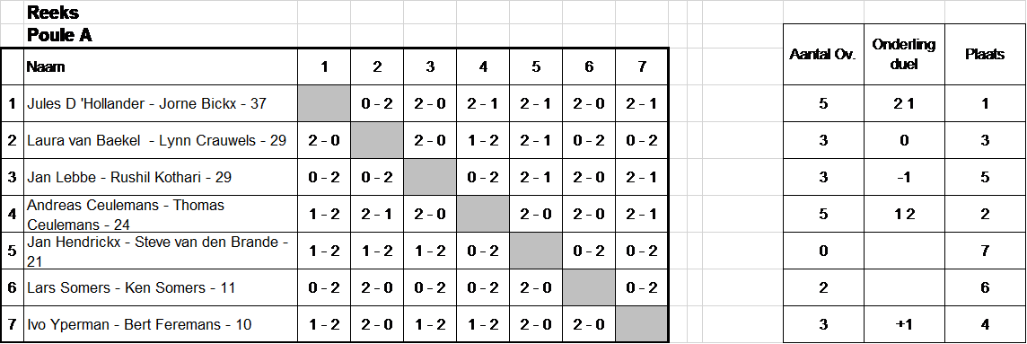 Poule A werd gewonnen door Jules en Jorne. Ze hadden net als de broers Andreas en Thomas één verliesmatch, maar hadden onderling gewonnen. Julles en Jorne verloren tegen het vrouwelijk geweld van Laura en Lynn. Zij konden zich net voor de winnaarstabel plaatsen door te winnen tegen Jan en Rushil. Ivo en Bert gingen ook mee naar de winnaarstabel. Vader Ken en zoon Lars speelden efficiënt alles in twee sets. Jan en Steve, het meest gemiddelde duo van de avond, slaagden er maar niet in om een wedstrijd te winnen. Later zal blijken dat ze zich gespaard hadden de eindfase!