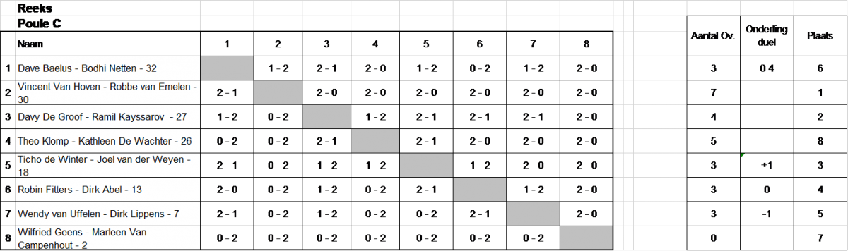 In poule C staken twee dubbels er bovenuit. Vincent en Robbe wonnen al hun zeven wedstrijden, en moesten maar één setje prijsgeven tegen Dave en Bodhi. Ook Theo en Kathleen waren goed op weg om een goede uitslag bijeen te spelen, ze hadden niet verwacht dat het zo laat ging worden en moesten de dag nadien competitie spelen en zijn dus vroeger vertrokken. Onderaan amuseerden Wilfried en Marleen zich en konden hier en daar bijna een setje afsnoepen van de tegenstanders. Door het vertrek van Theo en Marleen lag deze poule open. Davy en Ramil wonnen vier wedstrijden en werden hierdoor tweede. Er waren maar liefst vier dubbels met drie gewonnen wedstrijden, die plaats drie tem 6 moesten verdelen. Ticho en Joël kwamen er als beste uit, samen met Robin en Dirk gingen ze naar de winnaarstabel. Wendy en Dirk eindigden als vijfde. Dave en Bodhi wonnen tegen de verkeerde dubbels en eindigden als zesde.