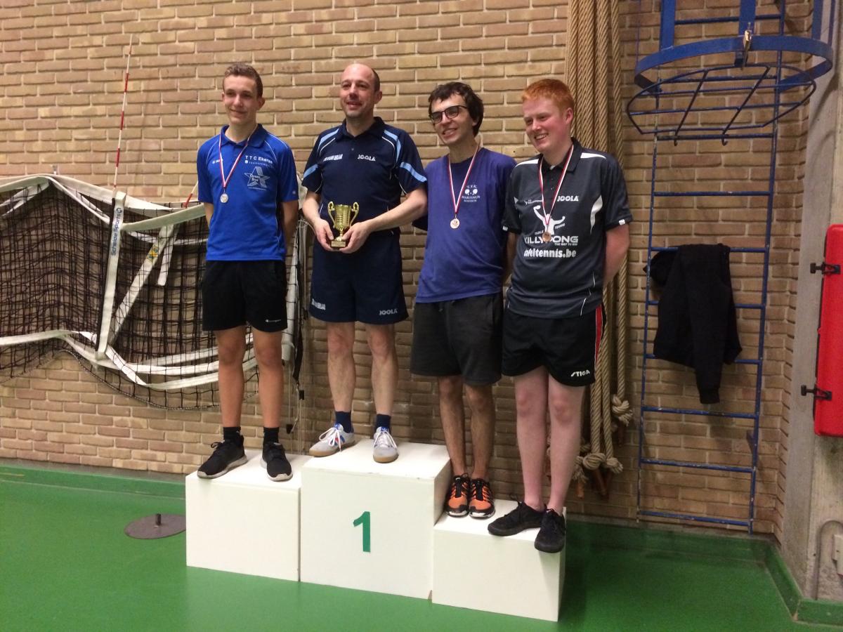 Kris (E0), ingeschreven in de E-reeks, had een prima dag en ging vlot door de poules. Hij won overtuigend alle wedstrijden in zijn groep. Drie keer winst met slechts twee verloren sets. Kris mocht meteen door naar de halve finale waarin hij de betere was van Pipoka-speler Hans Van Bael (E0). Kris won met 3-1.