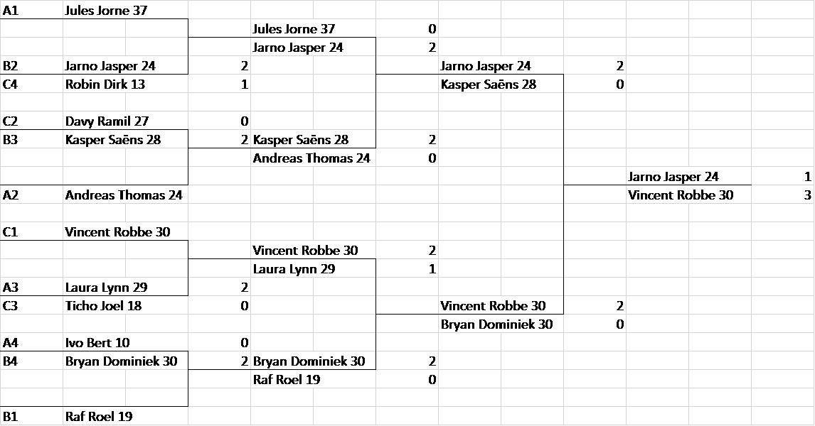 Jules, Jorne, Roel en Raf hadden op het einde van de Nacht het meeste aantal Affligems binnen en dat was ook te merken aan hun niveau, ze waren als poulewinnaar vrijgesteld en moesten zich in de kwartfinale met duidelijke cijfers gewonnen geven. Vincent en Robbe konden hun poulewinst wel verder doorzetten in de kwartfinale. De halve finales werden allebei met 2-0 gewonnen door Jarno en Jasper en Vincent en Robbe.