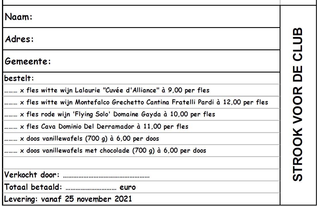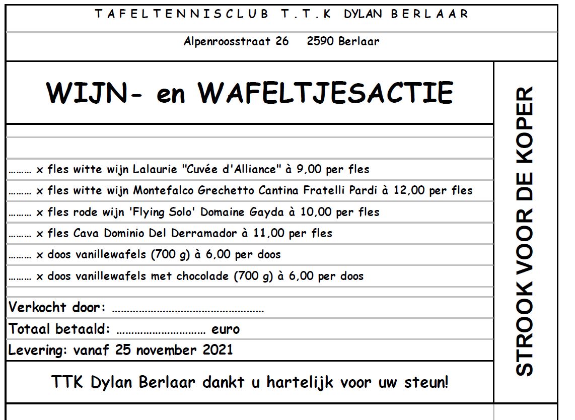 De wijn- en wafeltjesactie van TTK Berlaar is weer volop bezig. De wijnkenners uit onze club hebben weer een heerlijke selectie samengesteld. Bestellen kan nog tot en met zondag 7 november. Bekijk hieronder het aanbod. De bestelbriefjes vind je in ons clublokaal, of kan je afdrukken van het voorbeeldje hieronder. Bezorg de briefjes met gepast geld aan een bestuurslid. Voor vragen of bestellingen via mail kan je terecht bij onze penningmeester via ronaldfre@skynet.be.