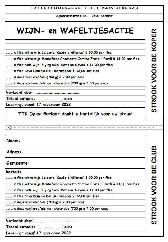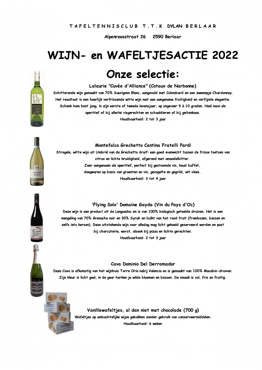 De wijn- en wafeltjesactie van TTK Berlaar is weer volop bezig. Er kan nog besteld worden tot en met maandag 31 oktober. De wijnkenners uit onze club hebben weer een heerlijke selectie samengesteld.