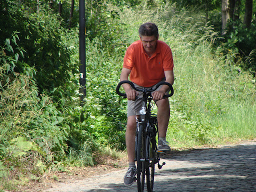 Het is zover, het summum van deze familiefietstocht: de Koppenberg, 600m lang en een maximum helling van 22% (da's 10cm meer per 5 meter). We beginnen zoals we de vorige bergjes begonnen zijn: rustig, maar met een vast & strak tempo. Opletten, want er zitten enkele veraderlijke steile hellingen in! Enkelen stappen af. Op het moment dat ik zit te denken dat het geen schande is om hier af te stappen, val ik stil en is er geen beweging meer in te krijgen. Die 10cm is er teveel aan, en we geven ons gewonnen. Slechts 4 halen het podium op de Koppenberg: Rene (uiteraard), Gie (beresterk op de fiets), Karin (met de extra NewtonMeters) en Vincent.