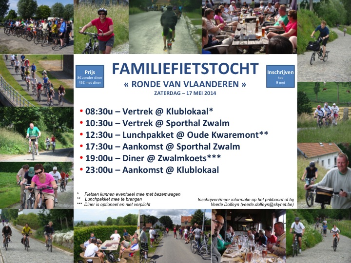 We vertrekken om 8u30 aan de club richting Zwalmstreek voor een tocht van ongeveer 65 km. Er is vervoer voor een aantal fietsen voorzien, maar als je zelf je fiets en eventueel nog extra fietsen kan vervoeren is dat zeker welkom. Onderweg is er een halte bovenop de Oude Kwaremont, waar we ons lunchpakket (mee te nemen!) kunnen nuttigen.
