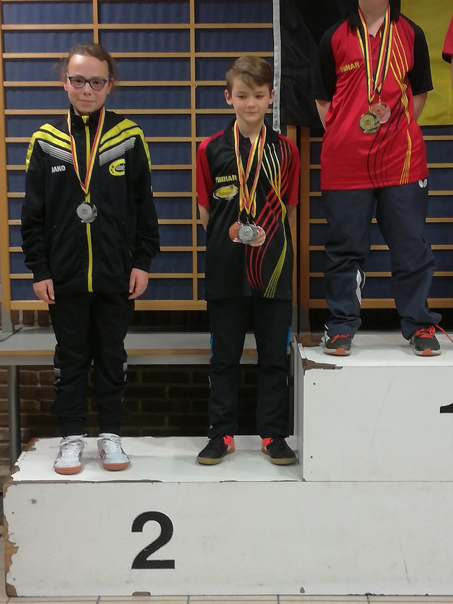 Siebe De Winter was de grootste slokop, met twee bronzen en een zilveren plak. Als E2 en 1ste jaars pré-miniem kwam Siebe voor de eerste maal piepen op een BK ... en hij deed dadelijk van zich spreken met drie medailles in drie reeksen, meteen ook de enige medailles voor de provincie Antwerpen op de eerste dag. In dubbel jongens pré-miniemen had provinciale trainer Pieter hem gekoppeld aan Jelle Campers, ook een Antwerpse topper (E4) van Merksplas. Een moeizame eerste overwinning was nodig om een systeem te vinden en daarna volgden nog twee zeges met veel beter spel en een goede vechtlust. Dat resulteerde in een halve finale plaats tegen het top-dubbelpaar uit Diest Tom Closset (C4) en Arne Daelemans (E6). Zelfs hier lagen kansen, maar het nipte verlies in de eerste set na een uit handen gegeven voorsprong zou cruciaal blijken: de tweede set was ook nog spannend maar 0-3 was uiteindelijk het logische verdict ... de dag kon echter al niet meer stuk met een bronzen medaille.